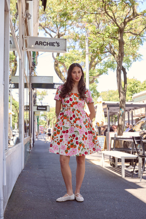 Un delizioso mini abito estivo color crema tenue, con un’incantevole stampa dipinta a mano di ciliegie, fragole e margherite fresche. Leggero, giocoso e perfetto per un picnic, questo modello unisce la dolcezza di ispirazione vintage alla praticità tipica delle giornate calde.