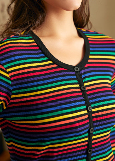Aumenta il comfort al massimo livello arcobaleno con questa deliziosa tuta intera Rocking ‘Round the Record Player dal sapore retrò, firmata ModCloth. Perfetta per le maratone di film, le pause ballo improvvisate e per aprire la porta al corriere senza vergogna, questa meraviglia ti avvolge in un comodo tessuto a coste elasticizzato dal collo alla caviglia. Le vivaci righe multicolore donano un’energia da “ritrovo anni ’70 in cantina che incontra la parata del Pride”, mentre i profili a contrasto e la classica abbottonatura completano il look, garantendo un tocco di nostalgia. Indossala, premi play sul tuo vinile preferito e preparati a rilassarti come la leggenda che sei.