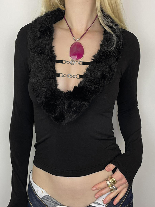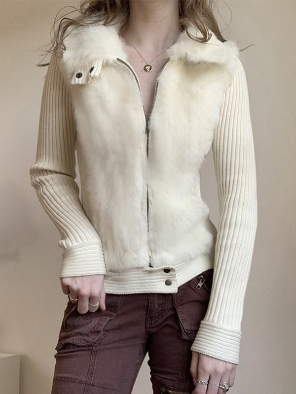 Cárdigan con solapa y cremallera en la cintura con parches peludos