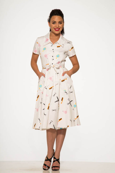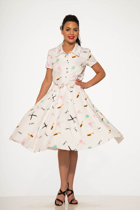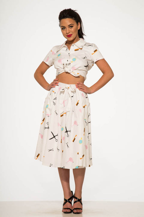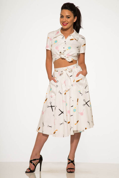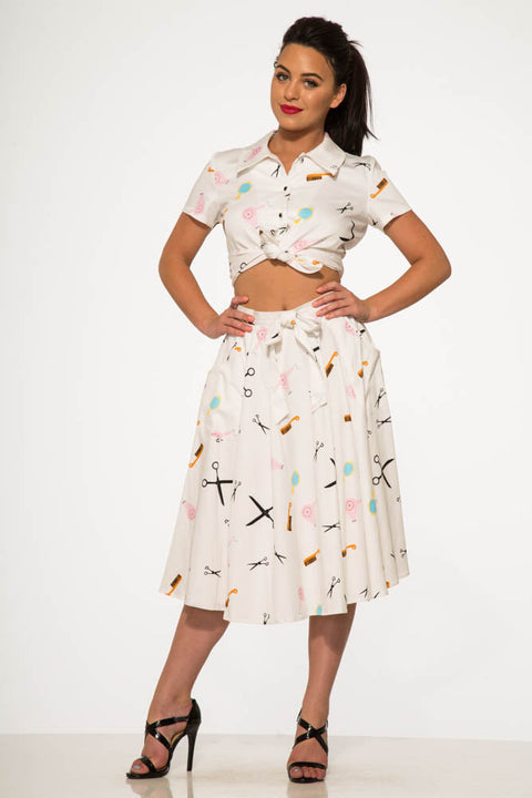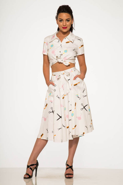 Taglia, acconcia e sfoggia un autentico look retrò con questo completo ispirato ai saloni di bellezza di Orchid Bloom! Composto da un elegante top con bottoni e laccetti sul davanti e da una gonna a ruota coordinata con stampa di graziose forbici, pettini e bigodini, questo completo è una dichiarazione d’amore ai giorni dei saloni vintage.