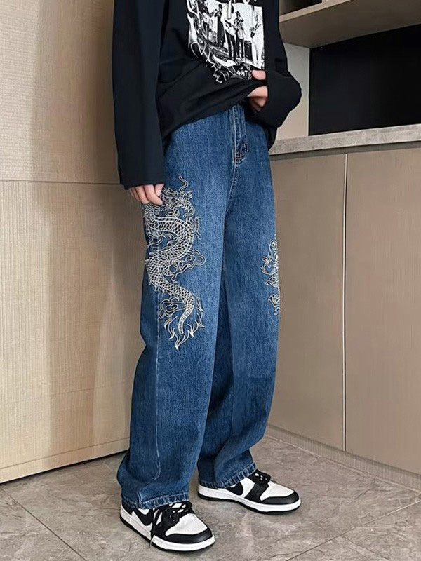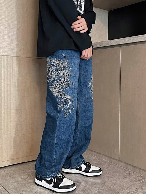 Diseño: Presenta atuendos chic de ambiente urbano, estos jeans de mezclilla lavados con forma de Corte recto, con dragón bordado en la pierna, cierre de cremallera y diseño de bolsillos funcionales.
