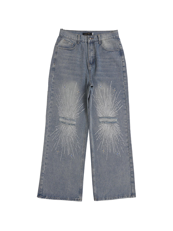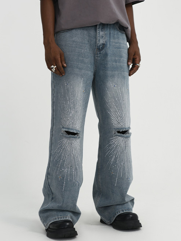Vaqueros de pierna recta rasgados con estampado de diamantes de imitación de fuegos artificiales para hombre