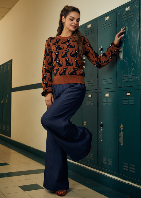 Aggiungi un tocco di malizia al tuo guardaroba con il maglione girocollo Notes of Nostalgia della nostra linea ModCloth. Nella fantasia Rustic Purr, questo comodo maglione presenta una stampa all-over di curiosi gatti neri, i cui grandi occhi risaltano su uno sfondo color ruggine caldo. Con il suo classico girocollo, i bordi a coste e la vestibilità comoda, è un capo facile da indossare a strati, perfetto per le passeggiate autunnali e per i ritrovi di Halloween. Abbinala al tuo denim preferito o a una gonna sbarazzina per un look che è allo stesso tempo comodo, eccentrico e felino.